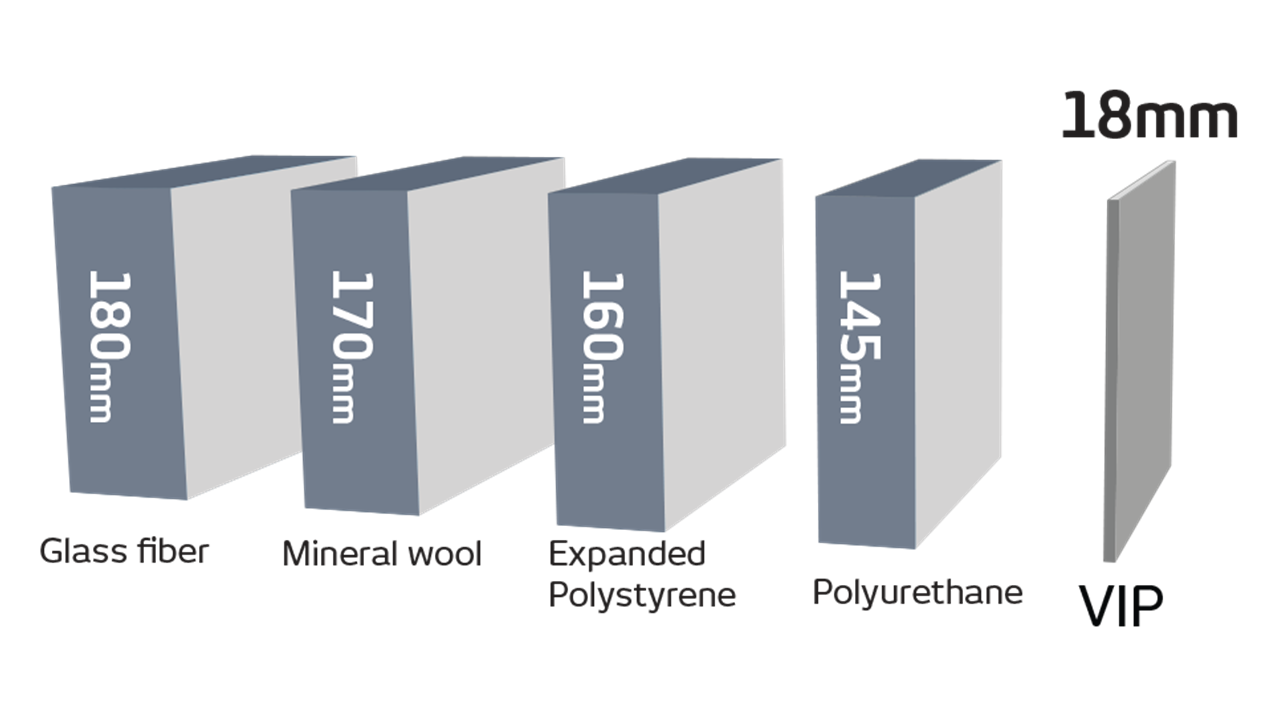 A comparison of insulating material thickness shows how Space Saving and Energy Efficient VIPs are.